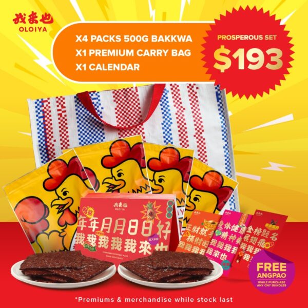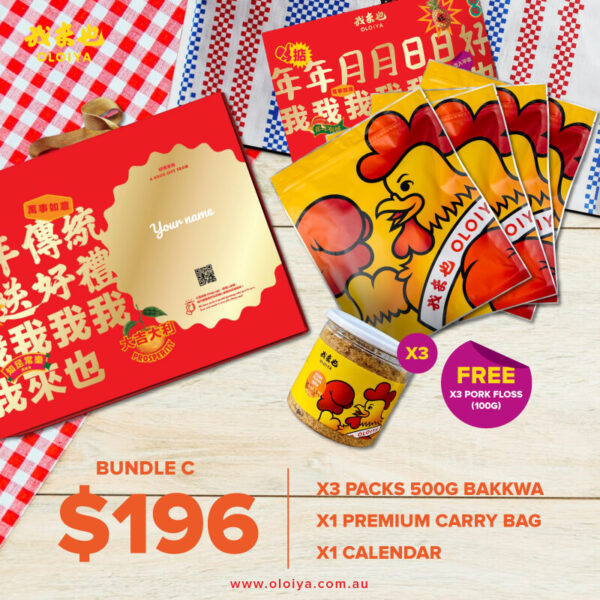 4 x Bakkwa (of your choice) + Premium Carry Bag + OLOIYA Limited Edition Calendar + Free Personalised Engraving + Gift Box + Pork Floss 100G x 3