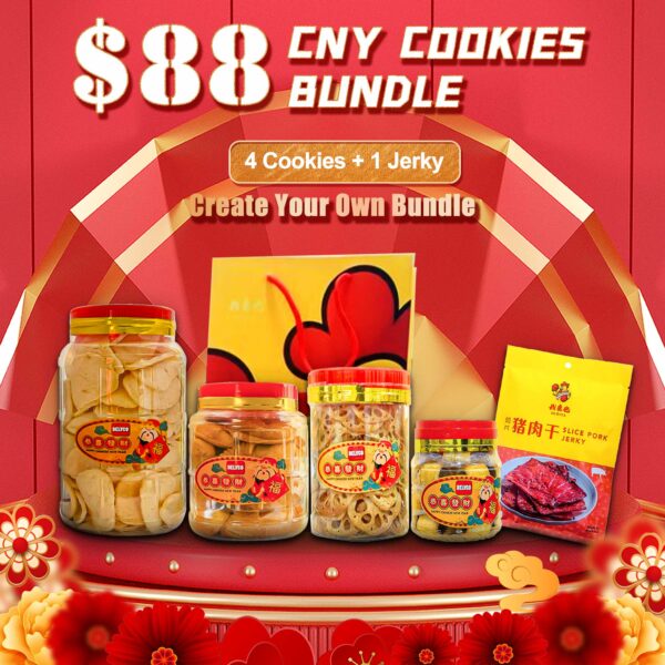 Enjoy any 4 Chinese New Year Cookies of your choice, paired with 1 premium Jerky, all for just $88! Our traditional Chinese snacks are freshly restocked and crafted to bring festive cheer to your holiday gatherings.